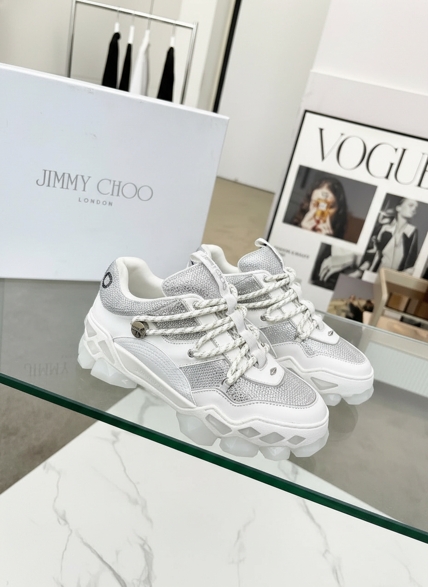 Jimmy Choo London white glitter chunky sneakers, luxury designer sports shoes with mesh upper and bold sole for stylish comfort.