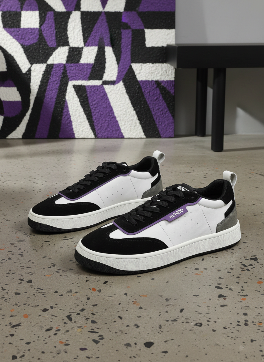 Kenzo men’s sneakers in black and white with purple accents, premium leather and suede, stylish design, comfortable fit, perfect for casual and streetwear fashion.