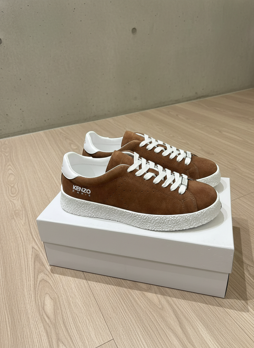 Kenzo Paris Suede Sneakers – Stylish brown low-top shoes with white laces and textured rubber soles, offering premium comfort and a modern casual look for everyday wear.