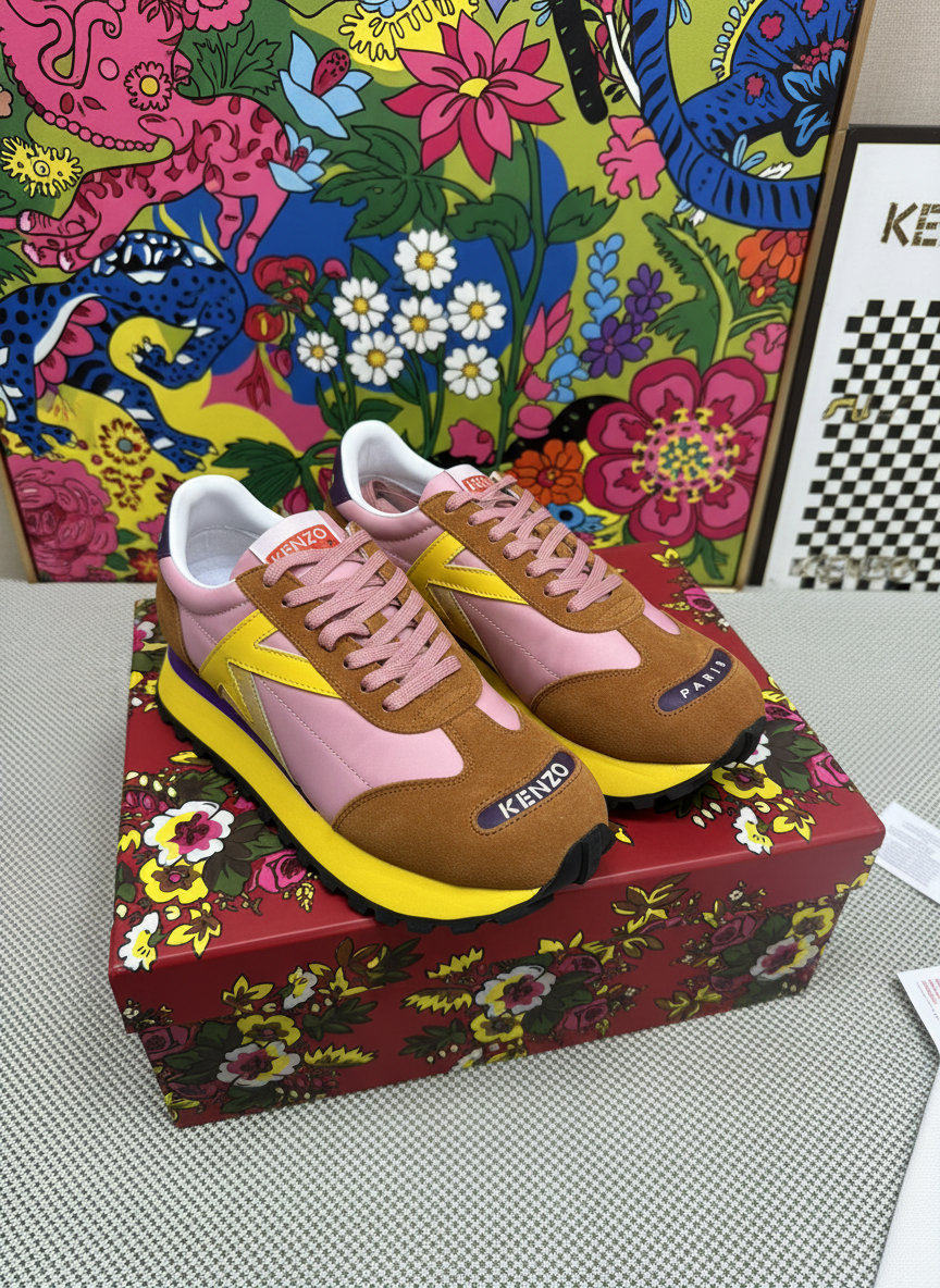 Kenzo Paris retro running sneakers in pink, yellow, and brown suede with floral box, stylish design perfect for casual wear and street fashion.