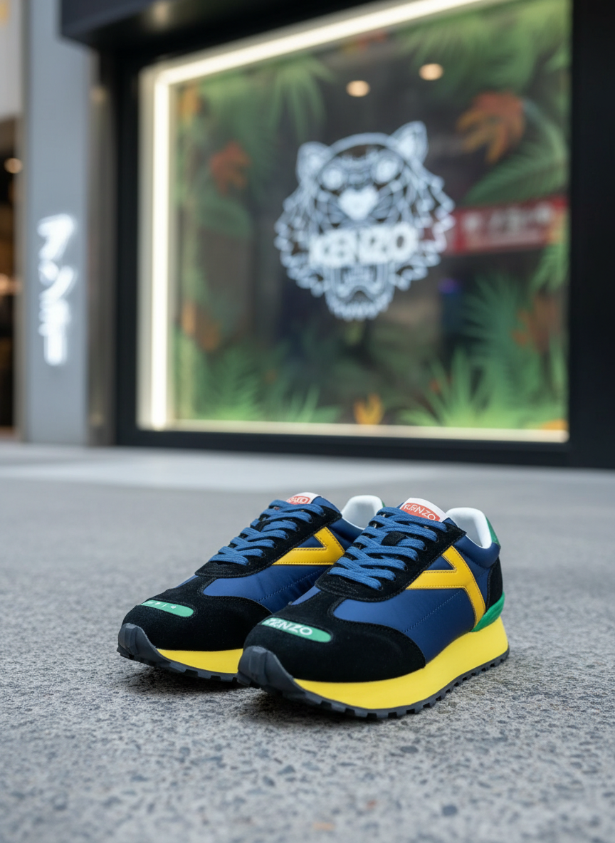 Kenzo Paris sneakers, stylish navy, yellow, and black design, premium comfort, perfect for casual wear and street fashion.