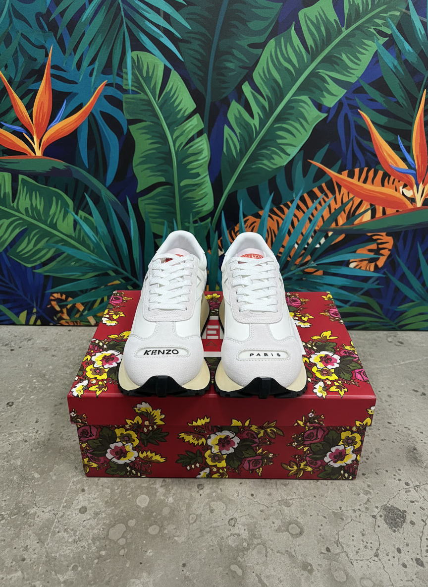 Kenzo Paris White Sneakers for Men and Women, featuring premium leather, retro running style, lightweight sole, and bold logo design, perfect for casual fashion and streetwear looks.