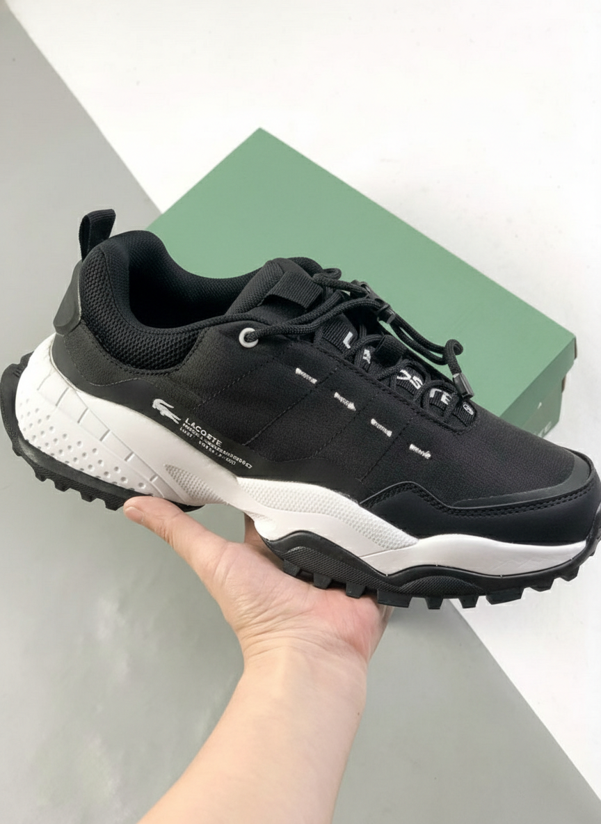 Lacoste black chunky sneakers, durable design with cushioned sole, perfect for casual wear and outdoor activities, available sizes 36-45.