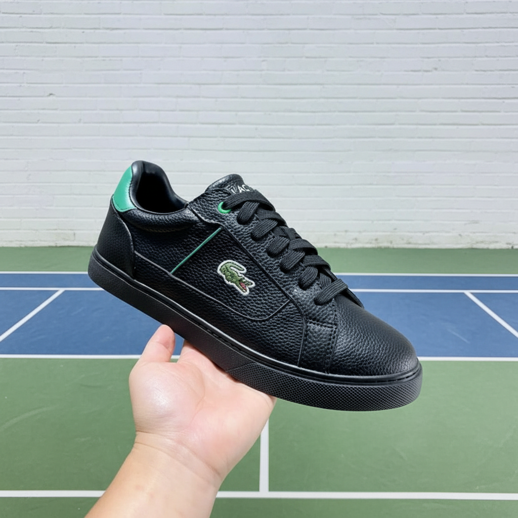 Lacoste black leather sneakers with iconic crocodile logo, green accents, and durable rubber sole for casual style and all-day comfort.
