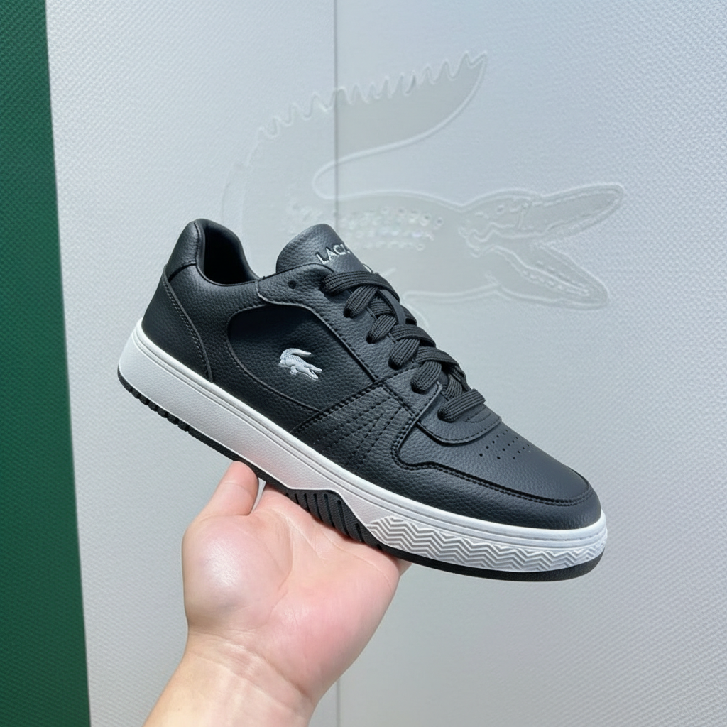 Lacoste Men’s Black Leather Sneakers with White Sole, Stylish Casual Shoes for Comfort and Durability, Perfect for Everyday Wear and Urban Fashion.