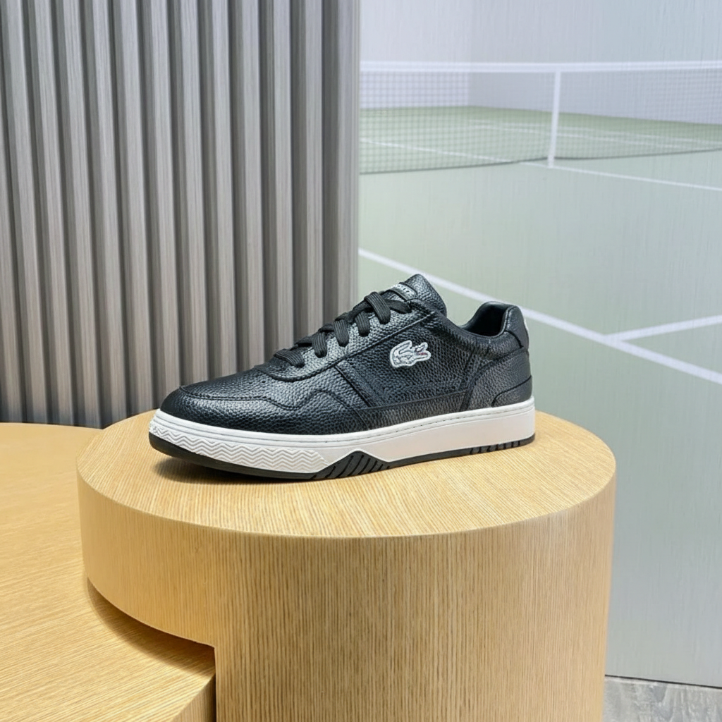 Lacoste black leather sneakers with iconic crocodile logo, durable rubber sole, stylish design, perfect for casual wear and sports.