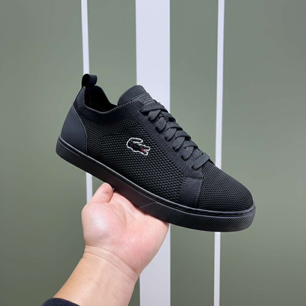 Lacoste black mesh sneakers with iconic crocodile logo, breathable design, lace-up closure, and durable sole for stylish comfort.