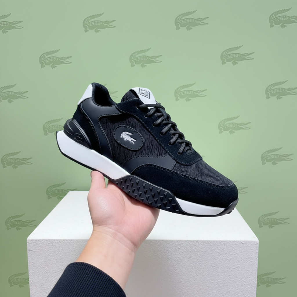 Lacoste men’s black sneakers with mesh and suede upper, lightweight cushioned sole, stylish design for casual and sports wear.