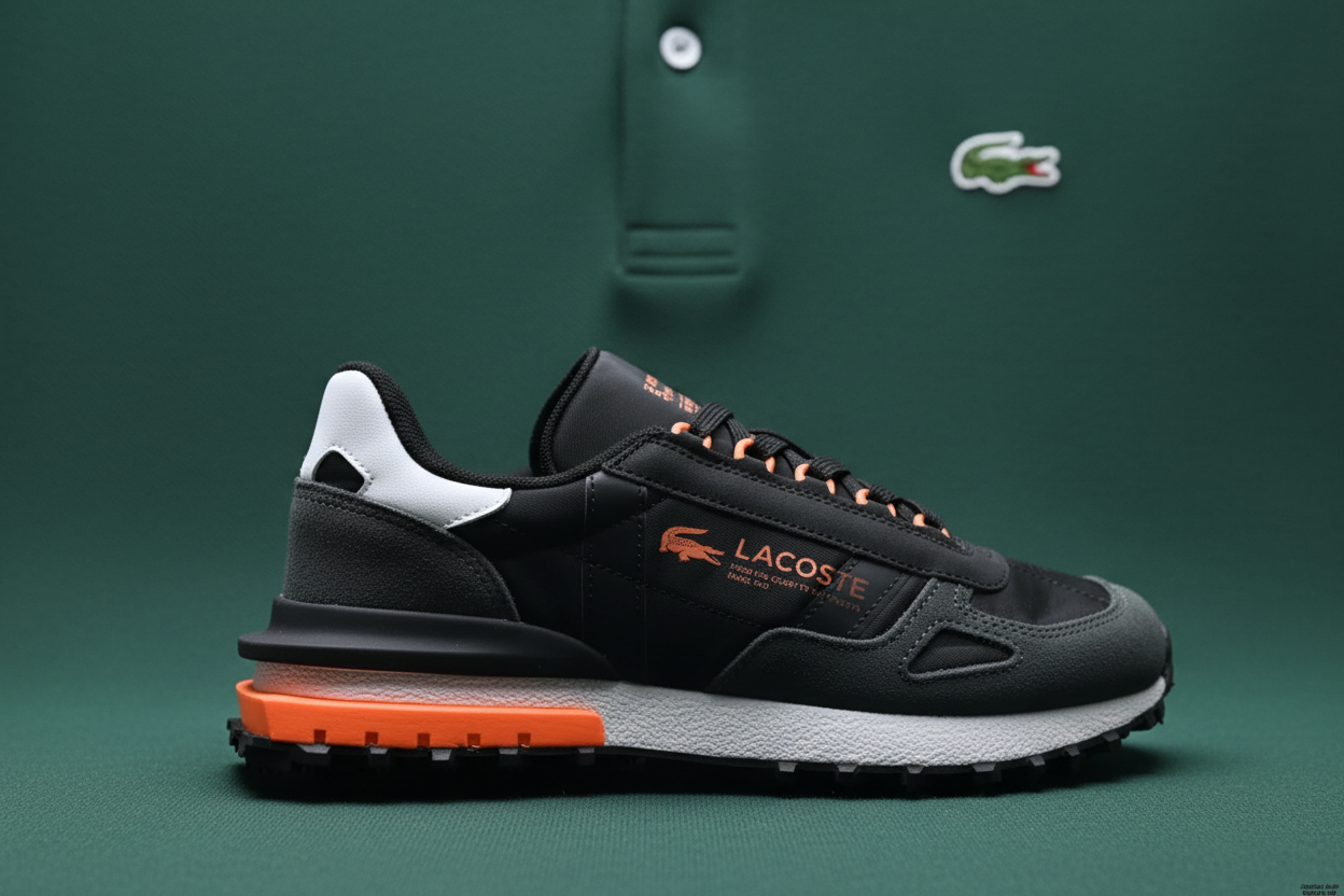 Lacoste Men’s Black Orange Sneakers, stylish athletic shoes with durable sole, breathable design, perfect for casual wear, sports, and street fashion.