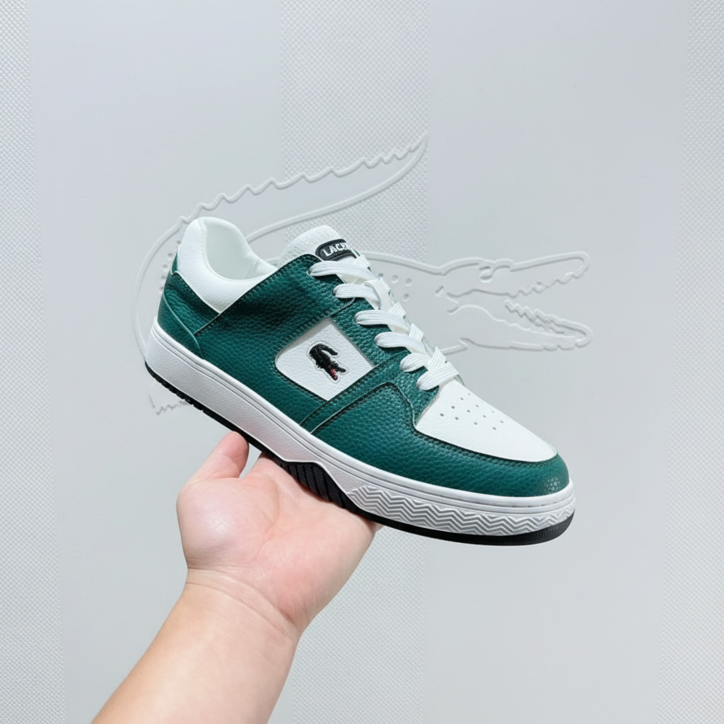 Lacoste men’s green and white leather sneakers, classic low-top design with crocodile logo, comfortable fit and durable sole for casual or sporty style.