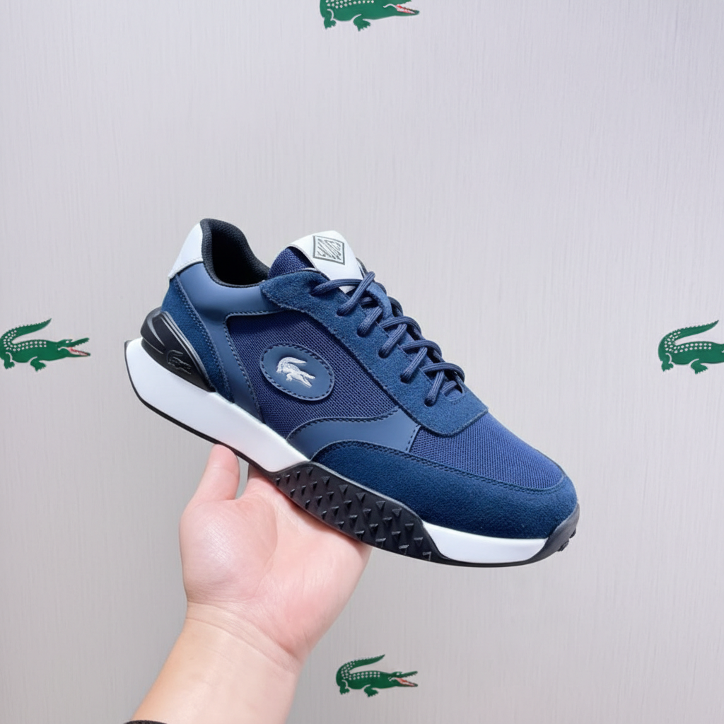 Lacoste men’s navy blue sneakers with breathable mesh, durable leather accents, cushioned sole, and classic crocodile logo for sporty style and all-day comfort.