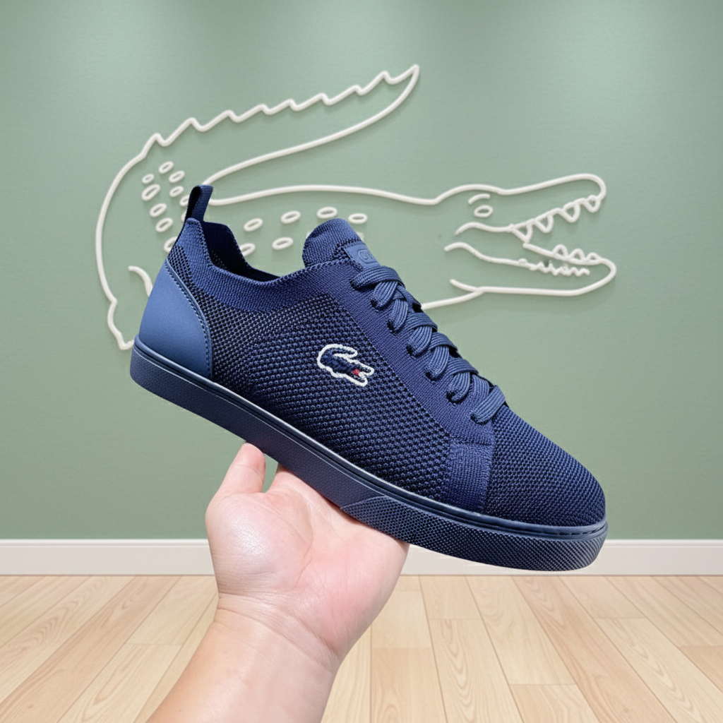 Lacoste men’s navy blue mesh sneakers with classic crocodile logo, breathable lightweight design, and durable rubber sole for casual and sporty style.