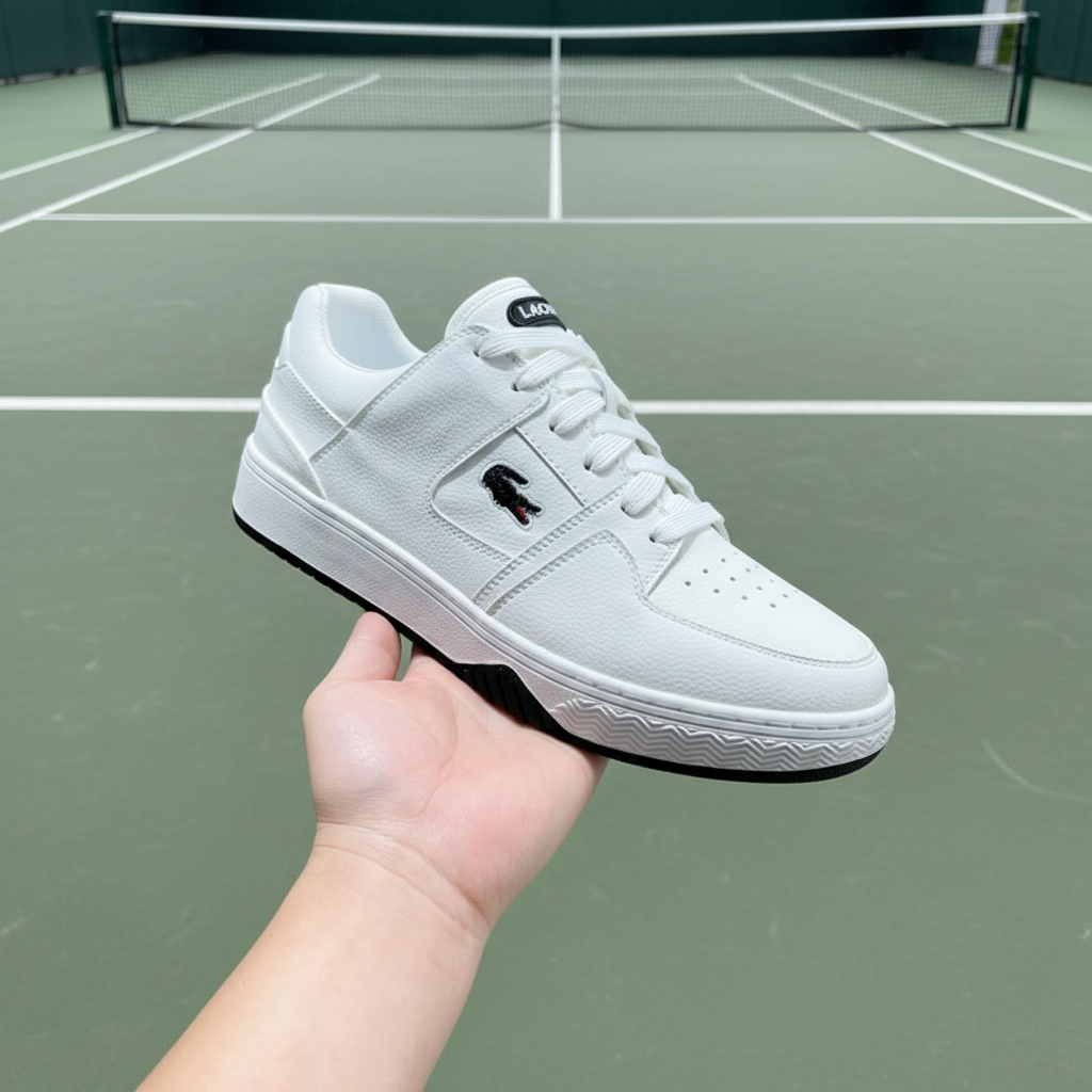 Lacoste white leather sneakers with iconic crocodile logo, durable rubber sole, lace-up design, perfect for casual wear and sports style.