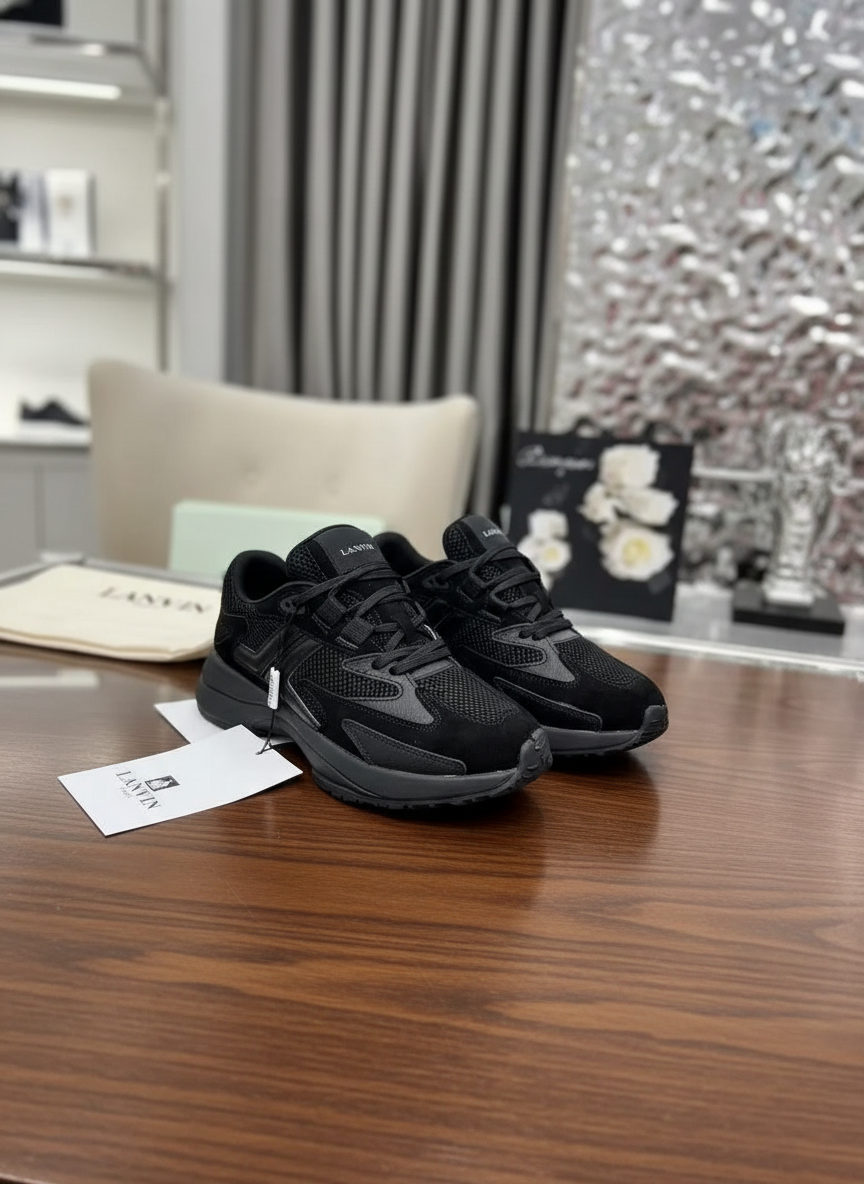 Lanvin Paris Black Mesh and Suede Sneakers combine modern luxury with comfort, featuring a sleek design ideal for fashion-forward men and women seeking premium casual style.
