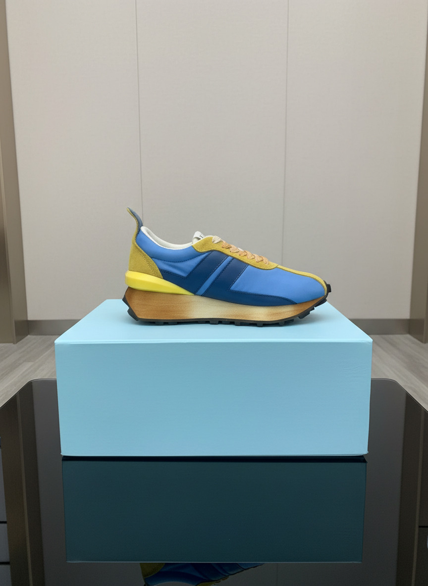 Lanvin men’s retro running sneakers in blue and yellow, featuring suede and leather details, cushioned sole, and stylish sporty design for casual and streetwear fashion.