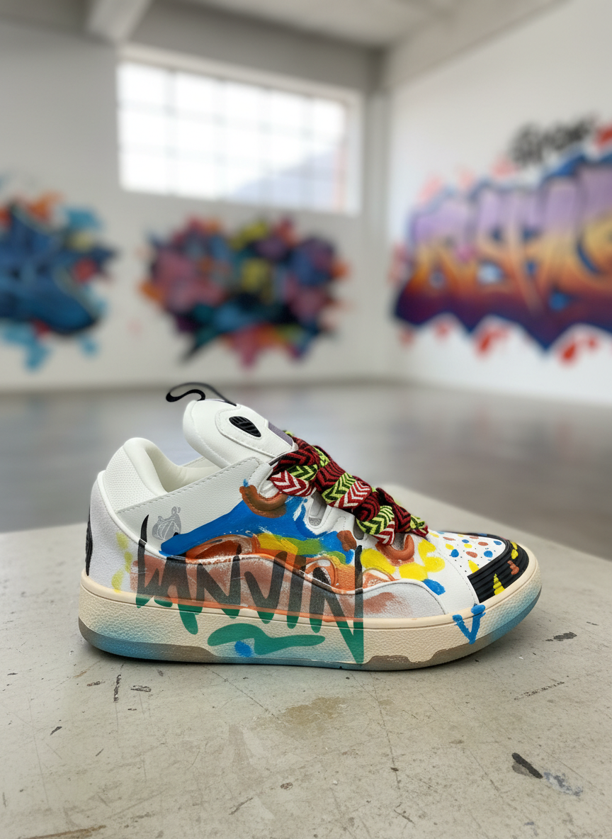 Lanvin men’s white low-top sneakers with colorful graffiti design, vibrant patterned laces, and premium leather for stylish streetwear fashion.