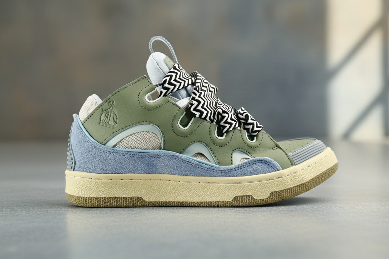 Lanvin stylish green and blue suede leather sneakers with unique zigzag laces, breathable mesh panels, and durable rubber sole, perfect for casual and streetwear fashion.
