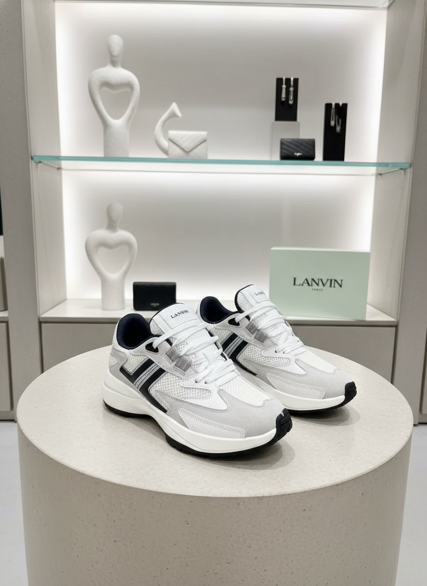 Lanvin Paris luxury sneakers in white and navy, featuring premium mesh and suede, cushioned sole, and modern sporty design for ultimate style and comfort.
