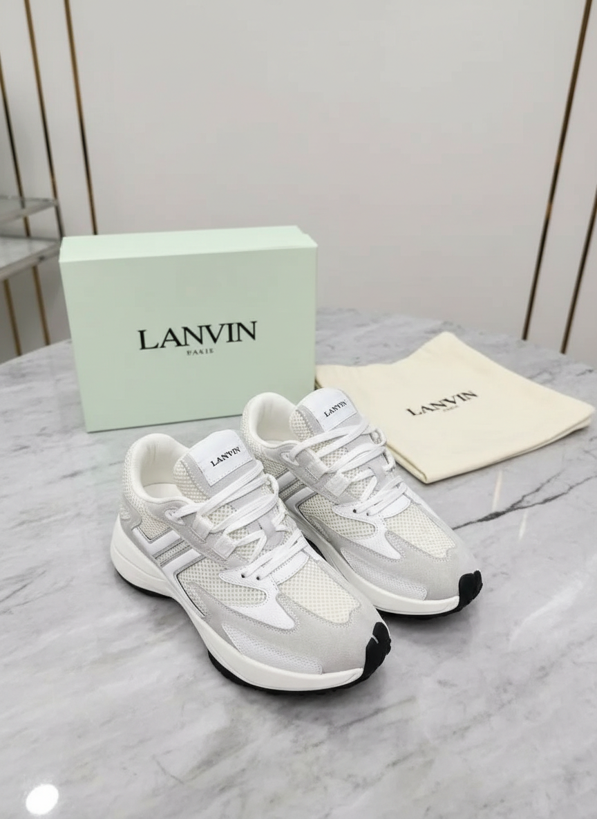 Lanvin Paris white mesh and suede sneakers, lightweight breathable design, luxury casual shoes for men and women, perfect for everyday wear and street style.
