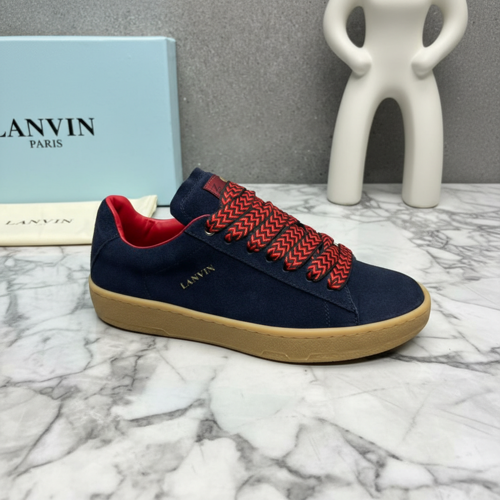 Lanvin Paris navy suede sneakers with red chevron laces, gum sole, and premium craftsmanship for stylish casual wear.