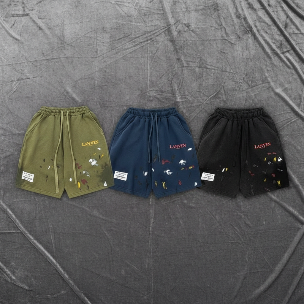 Lanvin Men’s Casual Paint-Splatter Shorts, Summer Loose Fit Drawstring Waist, Fashion Streetwear with Side Pockets, Available in Green, Navy, and Black.