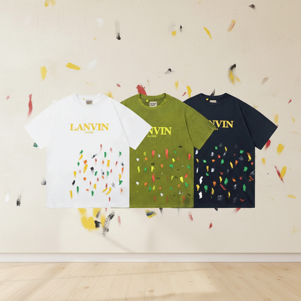 Lanvin Paris colorful print T-shirt, premium cotton, casual style, available in white, green, and black, perfect for streetwear and fashion lovers.