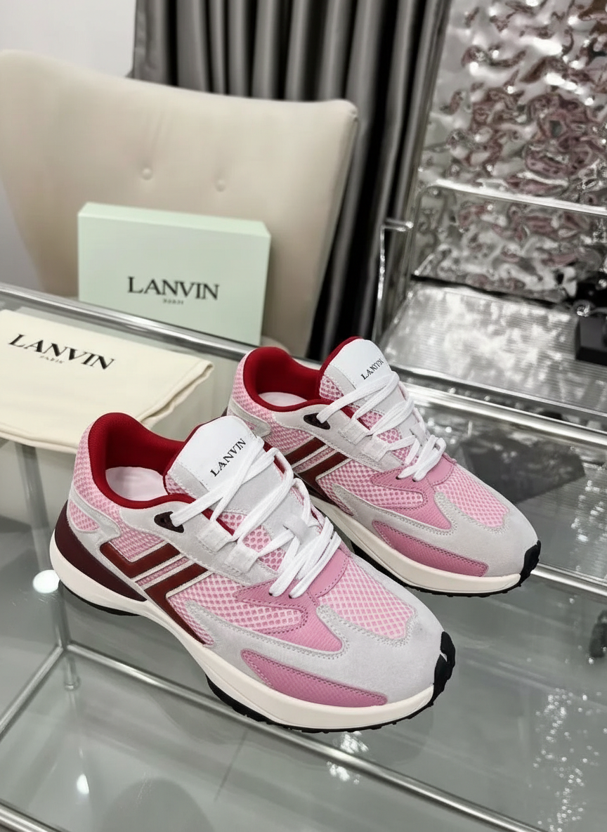 Lanvin Paris pink mesh and suede sneakers, stylish lightweight design with red accents, perfect for casual wear and street fashion.