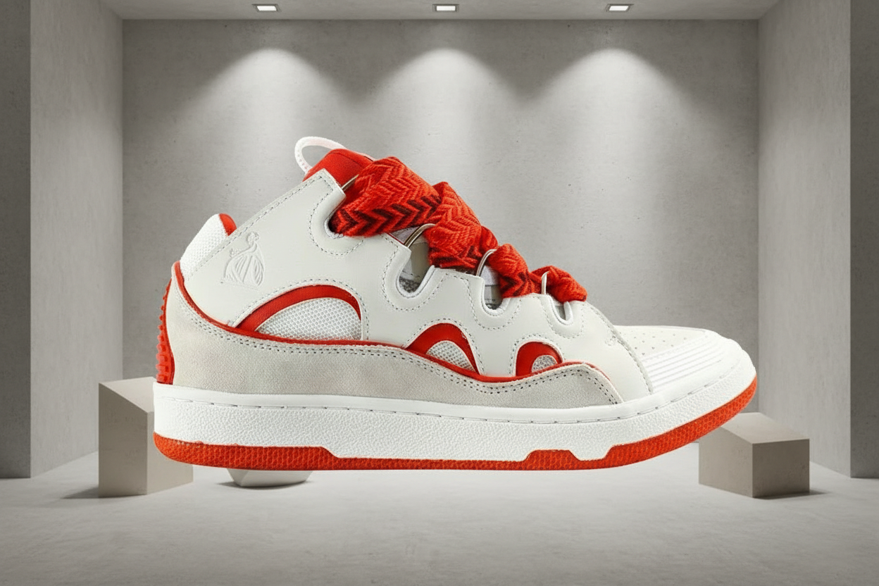 Lanvin white and red leather sneakers with bold chevron laces, suede accents, breathable panels, and durable rubber sole, available in sizes 35-46 for stylish everyday wear.
