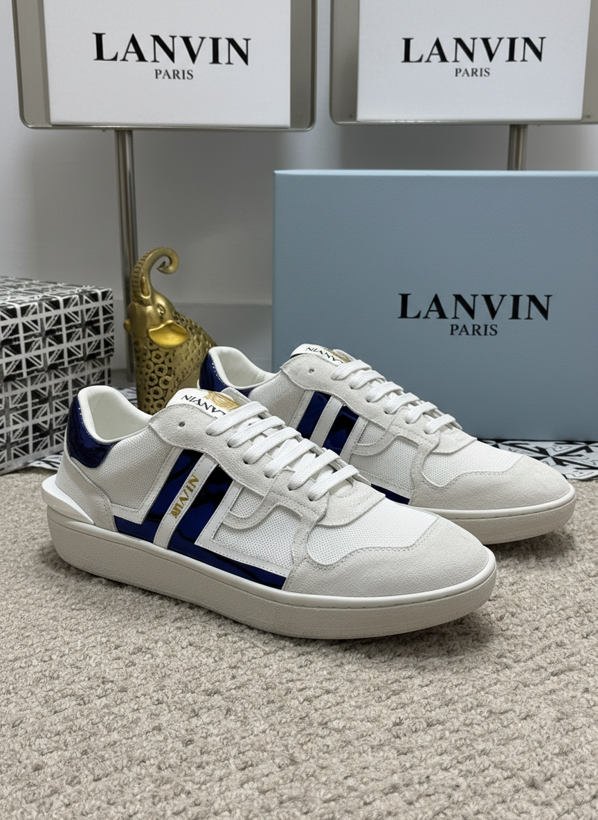 Lanvin Paris white and blue low-top sneakers, premium leather and suede details, stylish design, perfect for casual wear and fashion-forward looks.