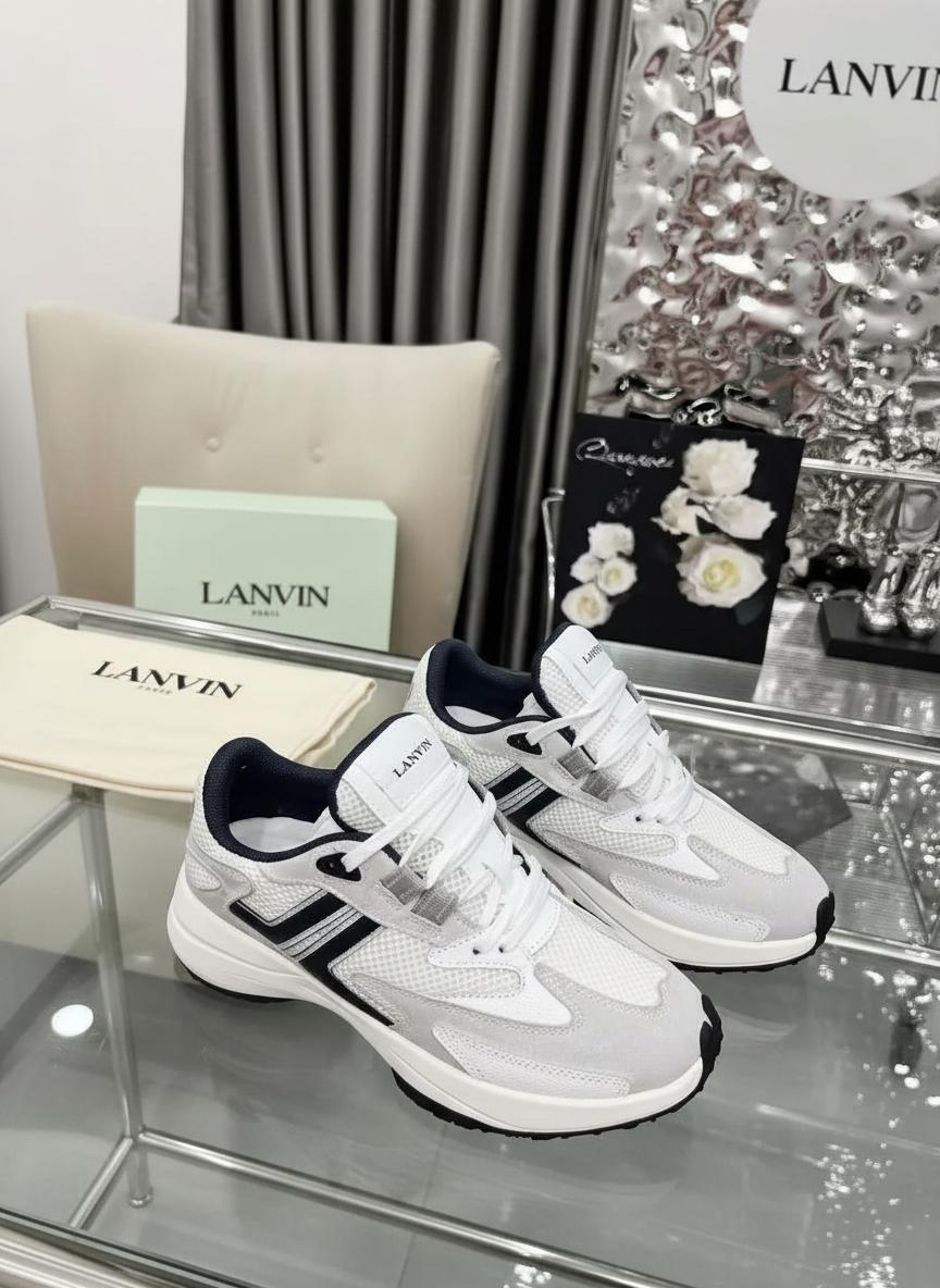 Lanvin Paris men’s white mesh and suede sneakers with navy accents, stylish lightweight design, perfect for casual wear and urban fashion.
