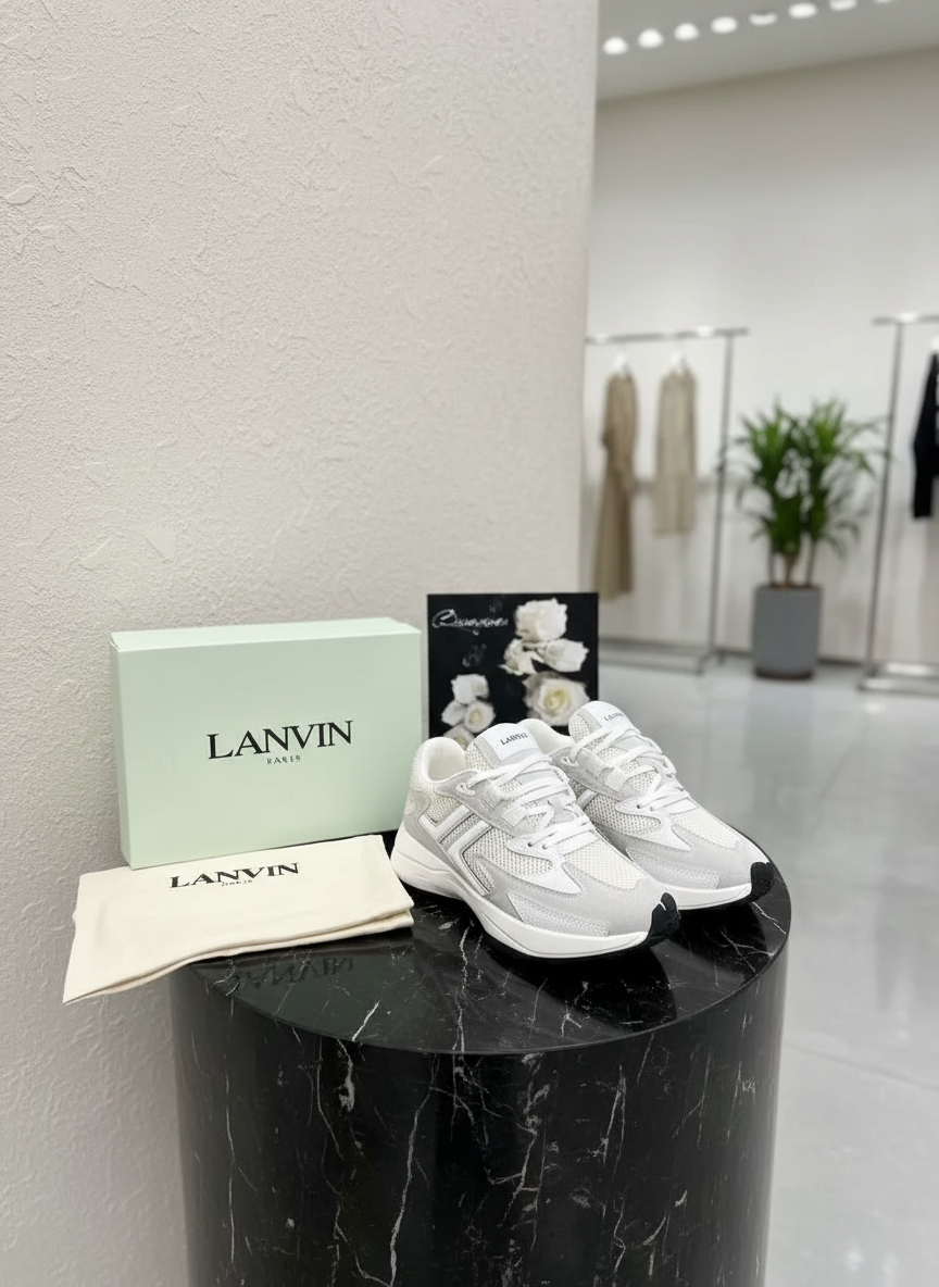 Lanvin White Mesh and Suede Sneakers, stylish lightweight running shoes with premium craftsmanship, perfect for casual wear and sports.