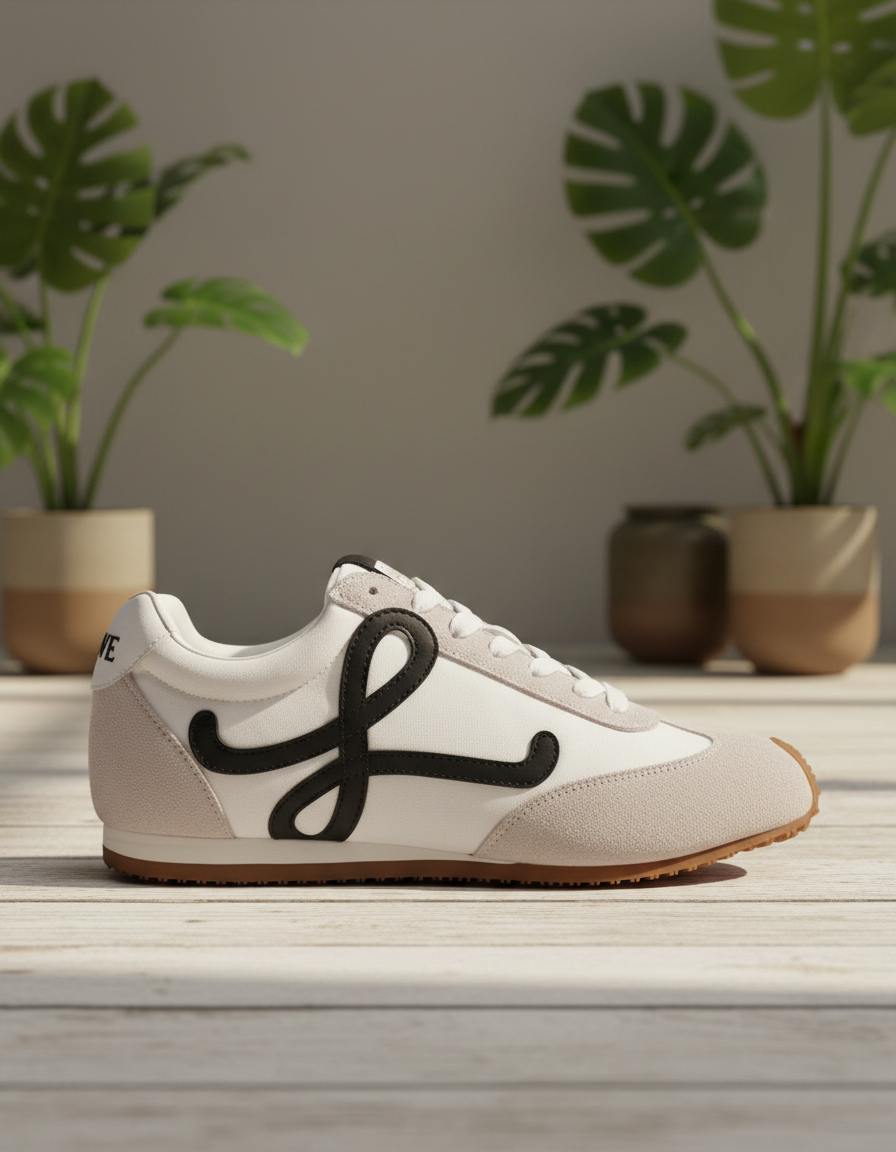 LOEWE men’s designer sneakers white and beige, featuring signature black logo, suede and leather mix, casual luxury comfort style, model UJTB1024ZVL sizes 35-44.