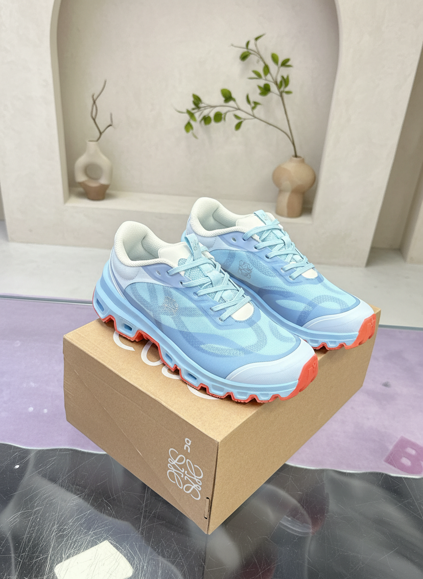 Loewe light blue mesh sneakers with white and red sole, stylish breathable design perfect for running, walking, and casual wear.
