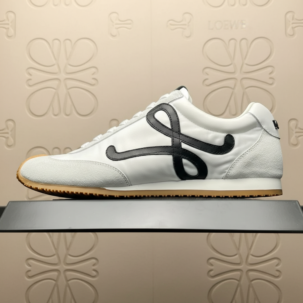 Loewe white leather sneakers with signature black logo, retro-inspired design, suede accents, and gum sole for stylish comfort and everyday wear.