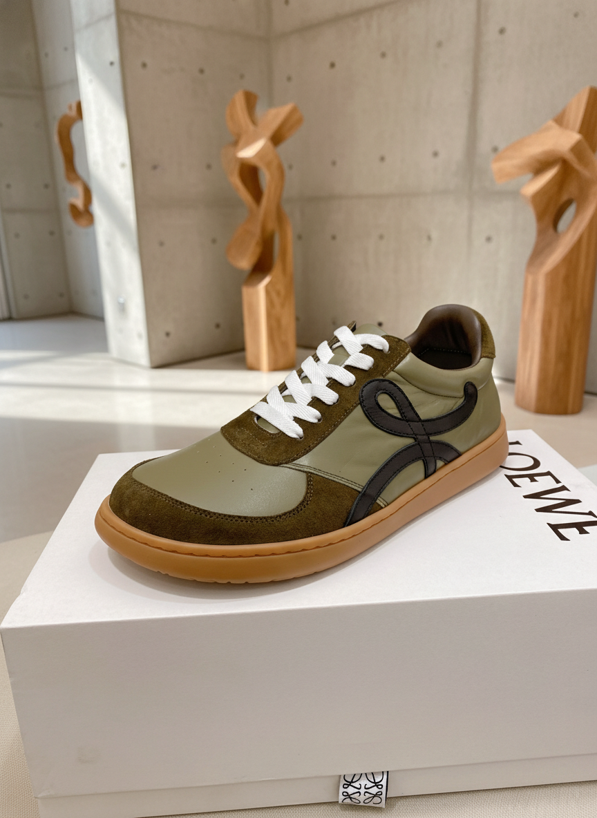 Loewe Men’s Olive Green Suede Leather Sneakers, stylish designer casual shoes with logo detail, comfortable rubber sole, perfect for streetwear and luxury fashion lovers.