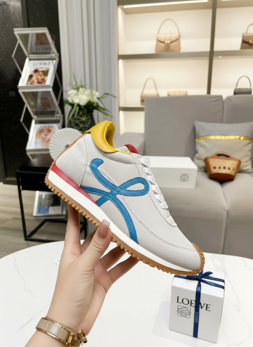 Loewe Sneakers feature premium suede, bold blue logo detail, and vibrant yellow heel. Stylish and comfortable shoes perfect for casual wear and trend lovers.