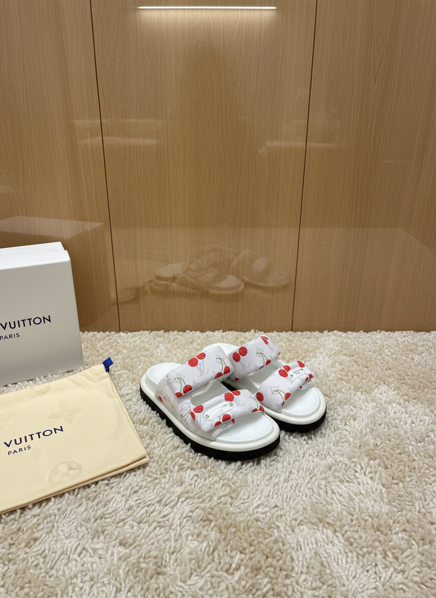 Louis Vuitton cherry print sandals, stylish white double-strap design, luxury fashion footwear perfect for summer casual wear.