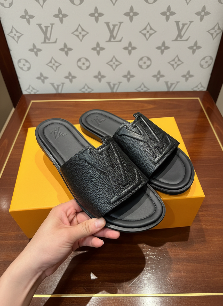 Louis Vuitton black leather slide sandals with iconic LV logo, premium comfort footbed, and stylish design perfect for casual wear or luxury vacation outfits.