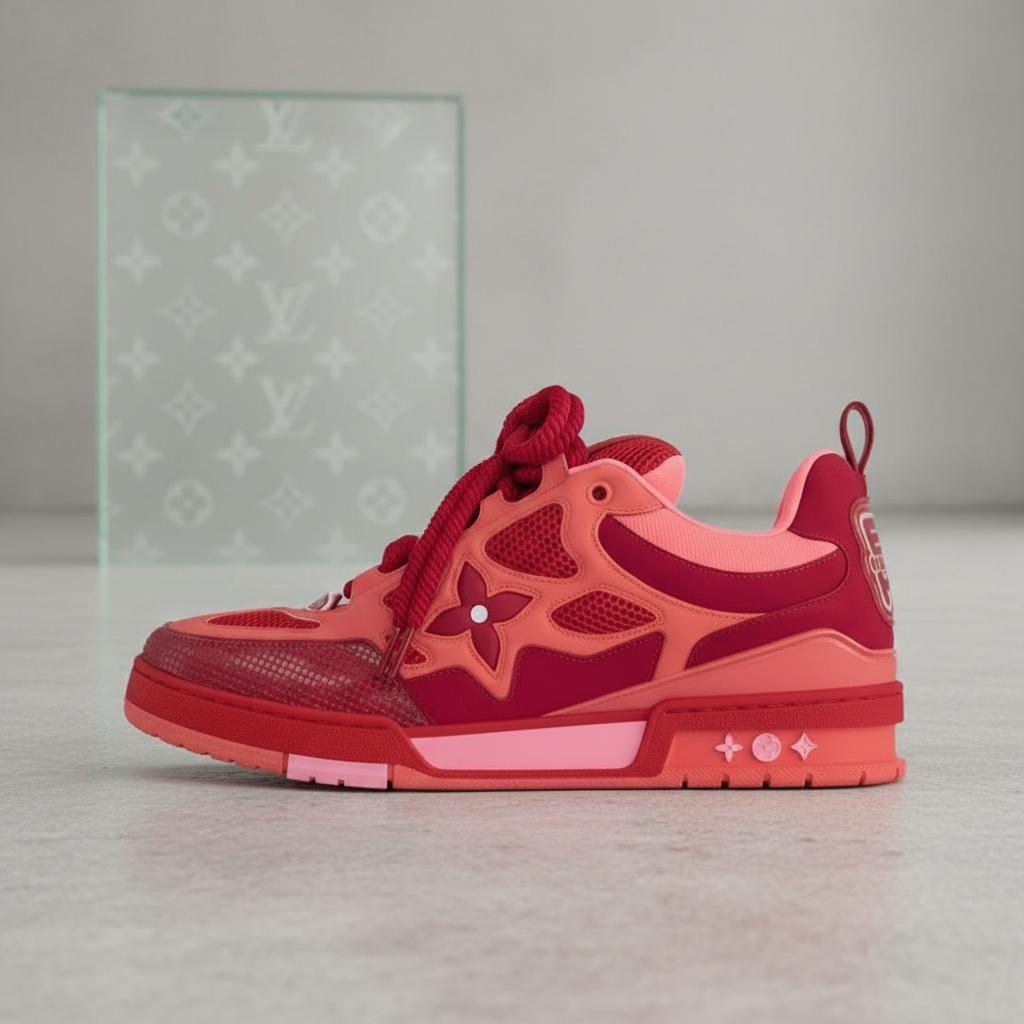 Louis Vuitton Red Low-Top Sneakers, stylish designer shoes with signature monogram details, premium materials, and vibrant color for luxury streetwear fashion.
