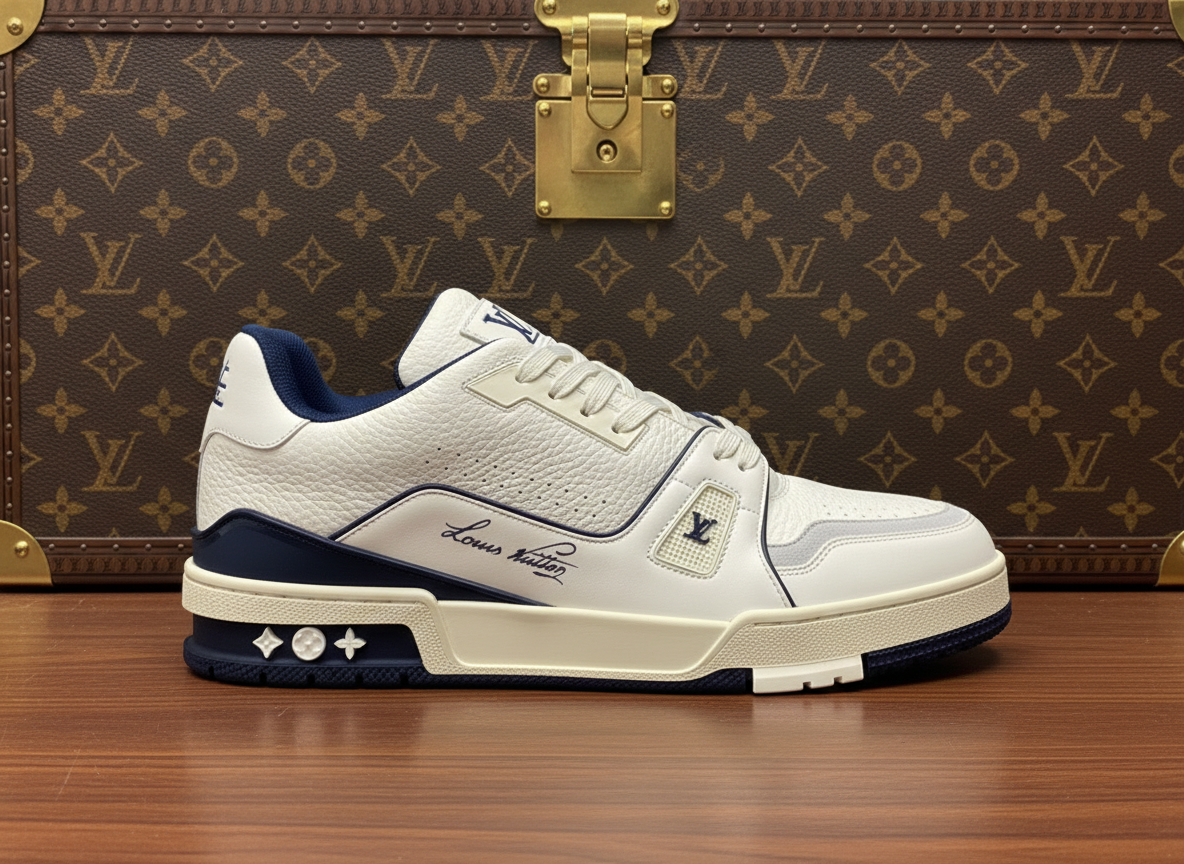 Louis Vuitton men’s white and navy leather sneakers, luxury designer casual shoes with signature LV logo, premium comfort and style for everyday wear.