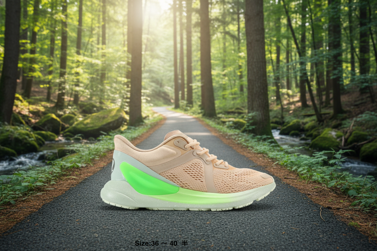 Lululemon lightweight breathable running shoes, mesh upper, cushioned sole, stylish beige with neon green accent, sizes 36-40, perfect for fitness and everyday wear.