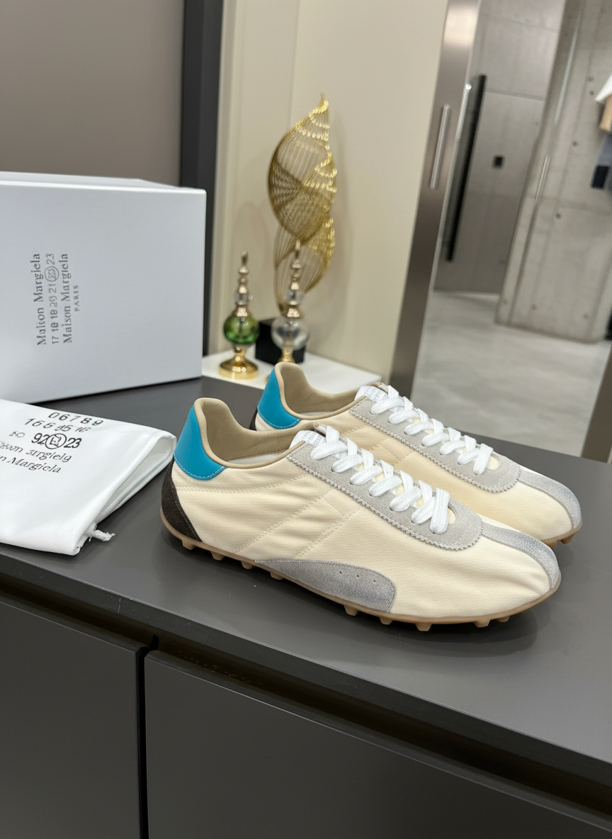 Maison Margiela beige and blue low-top sneakers with suede accents, white laces, and durable rubber sole, perfect for casual and sporty style.