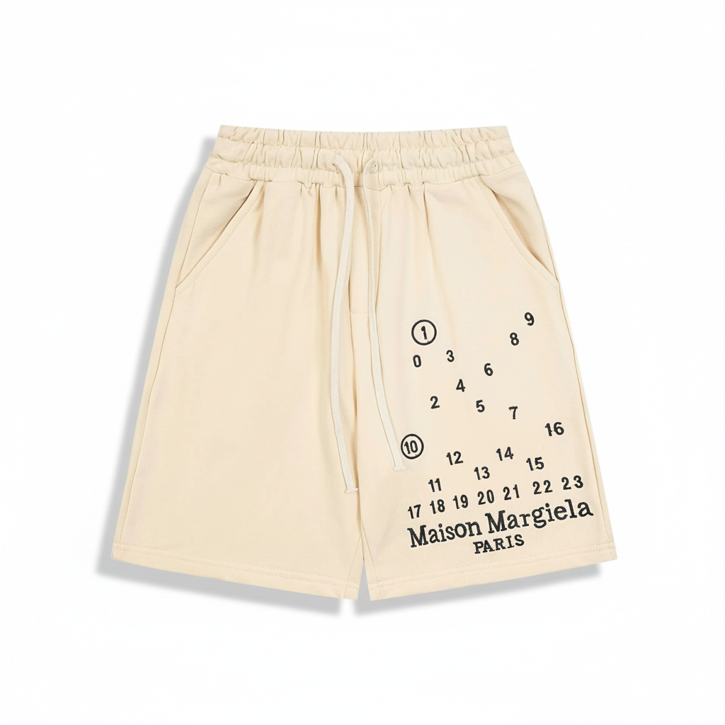 Maison Margiela Paris beige cotton shorts with signature numeric print, elastic waistband, and side pockets, perfect for casual summer streetwear style.