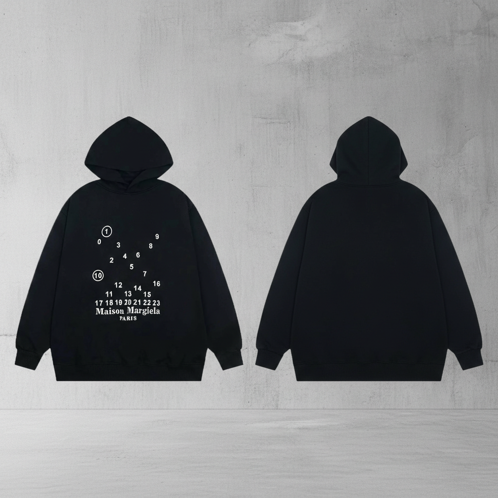 Maison Margiela Paris black hoodie with signature numeric logo, premium cotton, oversized fit, streetwear style, perfect for casual and fashion-forward looks.