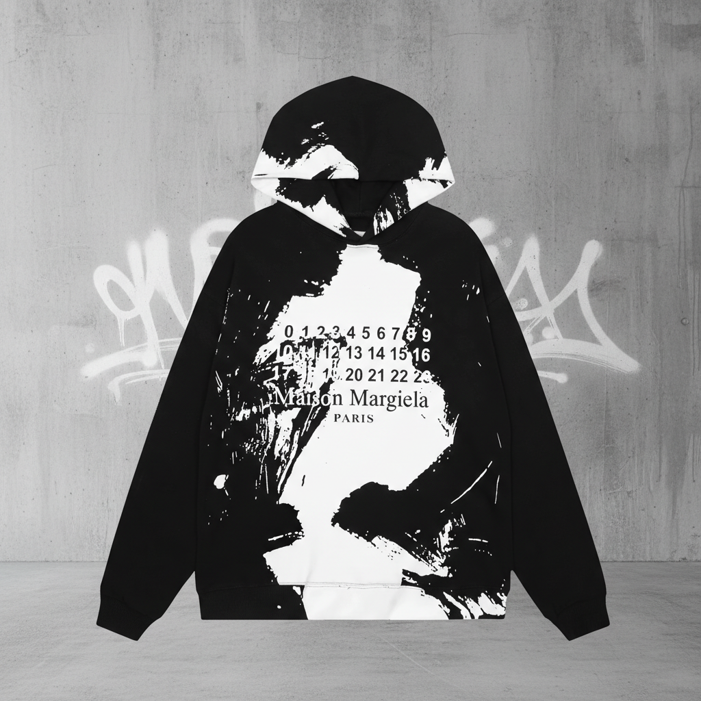 Maison Margiela Paris black and white abstract print hoodie, premium cotton, iconic number logo, stylish streetwear for men and women.