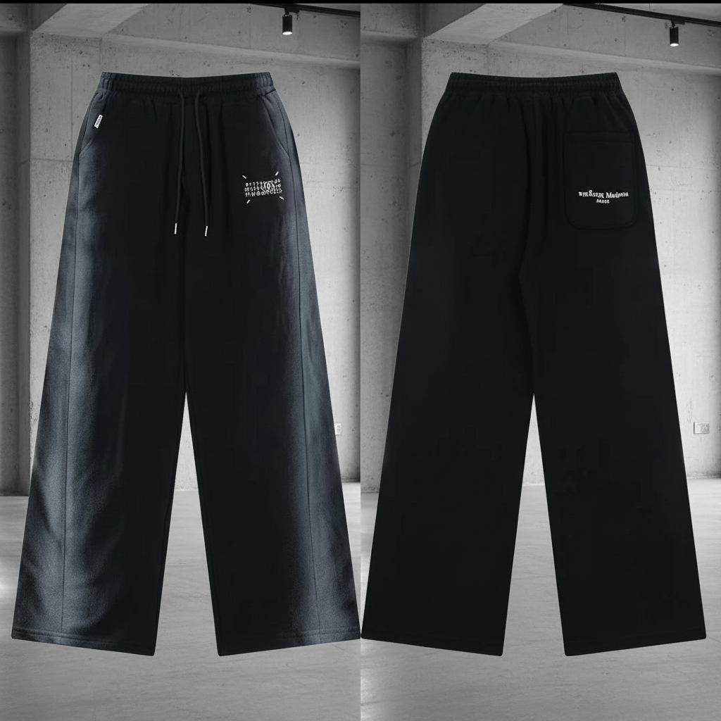 Maison Margiela black wide-leg pants with elastic waist, drawstring closure, and signature logo prints, perfect for casual or streetwear style.