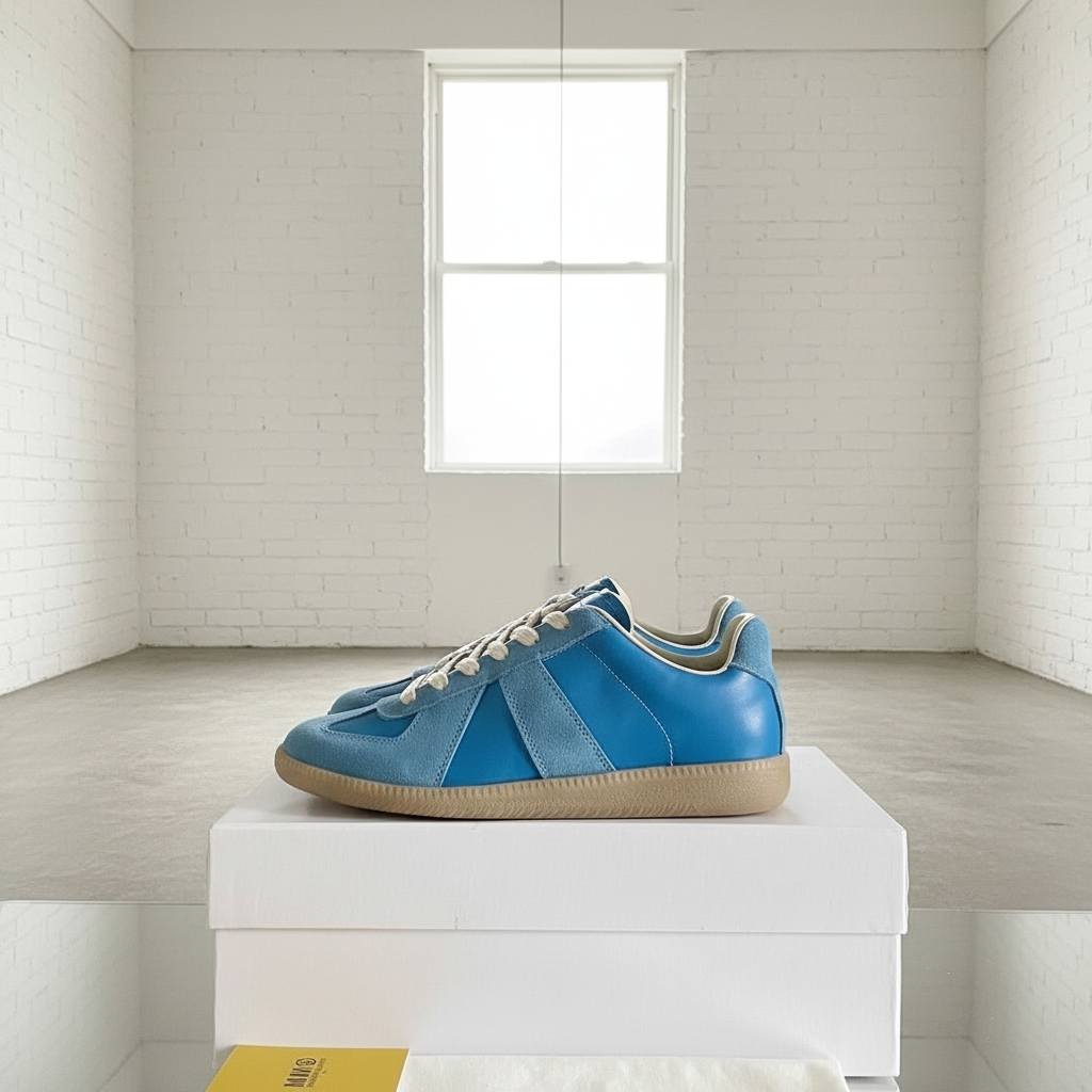 Maison Margiela blue leather and suede sneakers with gum sole, stylish lace-up design, perfect for casual wear and fashion-forward street style.