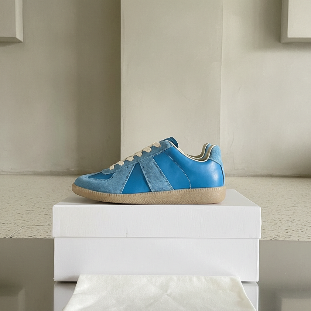 Maison Margiela blue leather and suede sneakers with classic low-top design, beige laces, and rubber sole, perfect for casual style and everyday wear.