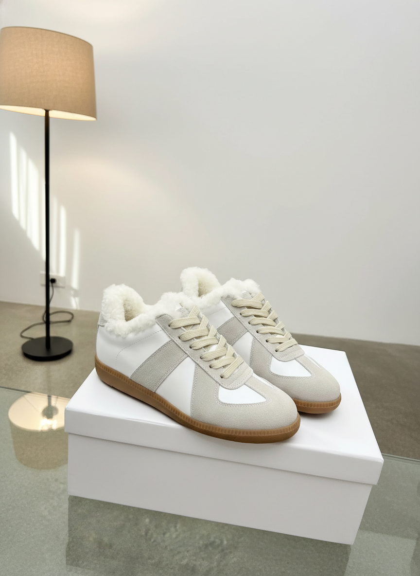 Maison Margiela white leather and suede sneakers with warm shearling lining, classic lace-up design, and gum sole, perfect for stylish comfort in cold weather.