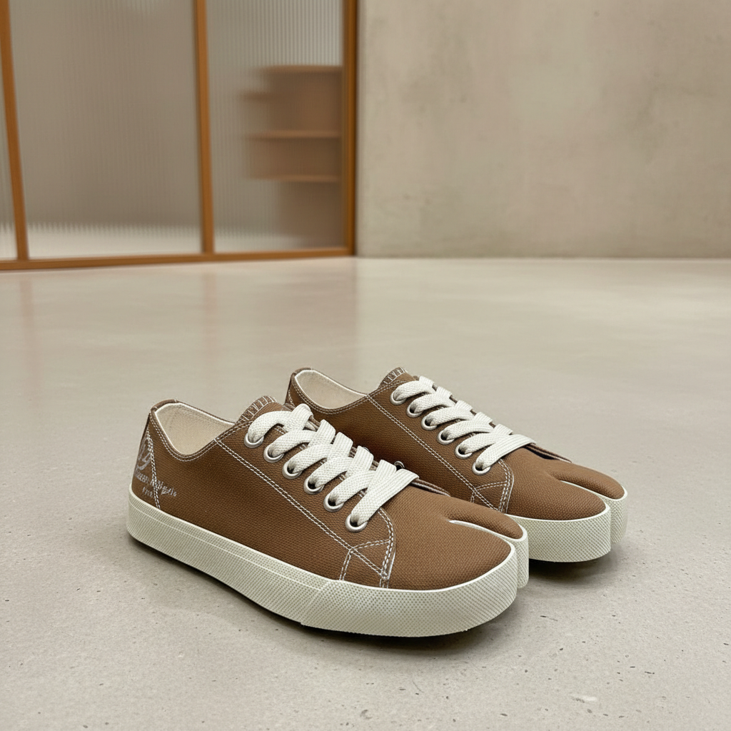 Maison Margiela brown canvas Tabi sneakers with split toe design, lace-up closure, and rubber sole, blending iconic style with everyday comfort for a unique fashion statement.